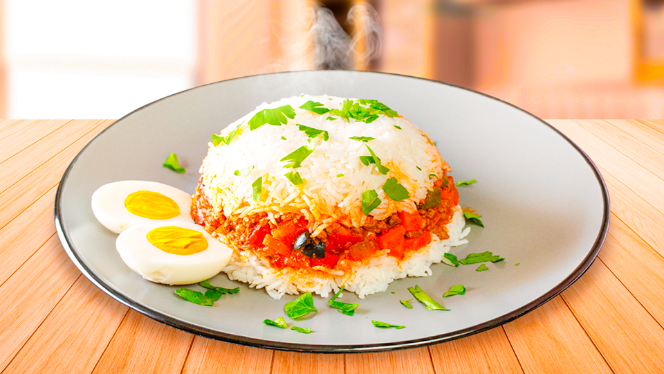 4. En un plato hondo colocar una capa de arroz, luego de relleno de carne y terminar con otra de arroz. Presionar bien. Voltear en un plato, decorar con perejil, huevo, pimentón y servir.