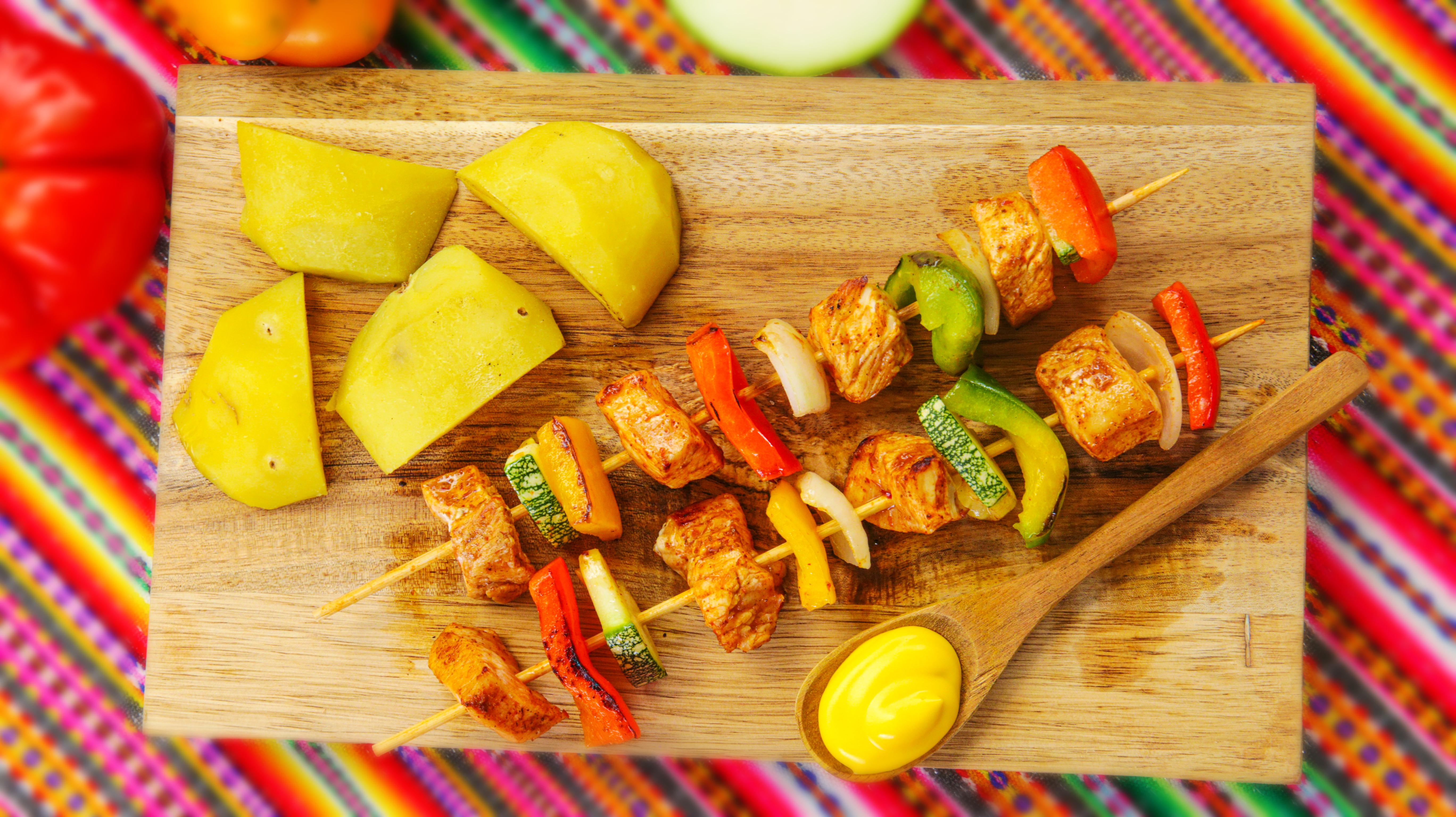 1. Cortar tamaño bocado la pechuga de pollo, así mismo los pimientos, cebolla y zucchini.